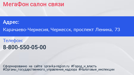 МегаФон, салон связи по адресу Карачаево-Черкесия, Черкесск, проспект Ленина, 73 в дальнейшем Организация, размещена в следующих категориях: