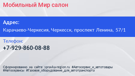 Мобильный Мир, салон по адресу Карачаево-Черкесия, Черкесск, проспект Ленина, 57/1 в дальнейшем Организация, размещена в следующих категориях: