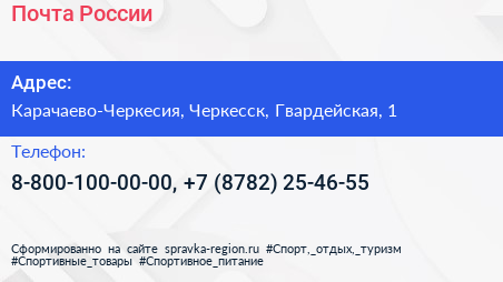 Почта России по адресу Карачаево-Черкесия, Черкесск, Гвардейская, 1 в дальнейшем Организация, размещена в следующих категориях: