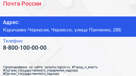 Почта России по адресу Карачаево-Черкесия, Черкесск, улица Панченко, 28Б в дальнейшем Организация, размещена в следующих категориях: