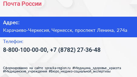 Почта России по адресу Карачаево-Черкесия, Черкесск, проспект Ленина, 274а в дальнейшем Организация, размещена в следующих категориях: