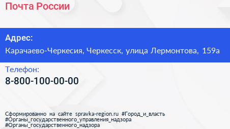 Почта России по адресу Карачаево-Черкесия, Черкесск, улица Лермонтова, 159а в дальнейшем Организация, размещена в следующих категориях: