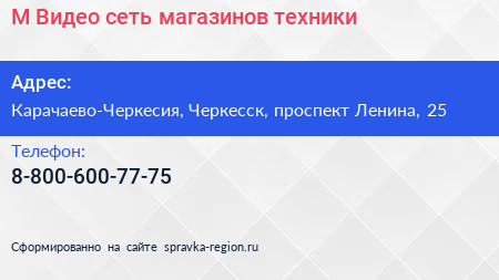 М.Видео, сеть магазинов техники по адресу Карачаево-Черкесия, Черкесск, проспект Ленина, 25 в дальнейшем Организация, размещена в следующих категориях: