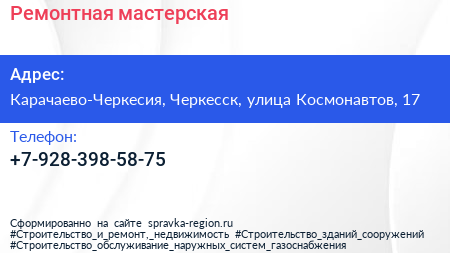 Ремонтная мастерская по адресу Карачаево-Черкесия, Черкесск, улица Космонавтов, 17 в дальнейшем Организация, размещена в следующих категориях: