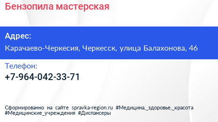 Бензопила, мастерская по адресу Карачаево-Черкесия, Черкесск, улица Балахонова, 46 в дальнейшем Организация, размещена в следующих категориях:
