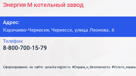 Энергия М, котельный завод по адресу Карачаево-Черкесия, Черкесск, улица Леонова, 6 в дальнейшем Организация, размещена в следующих категориях: