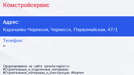 Комстройсервис по адресу Карачаево-Черкесия, Черкесск, Первомайская, 47/1 в дальнейшем Организация, размещена в следующих категориях: