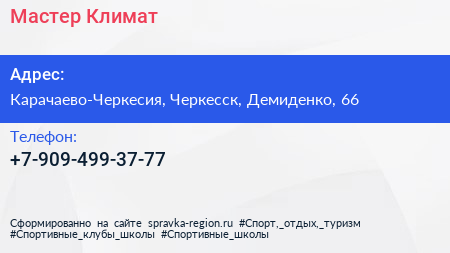 Мастер Климат по адресу Карачаево-Черкесия, Черкесск, Демиденко, 66 в дальнейшем Организация, размещена в следующих категориях:
