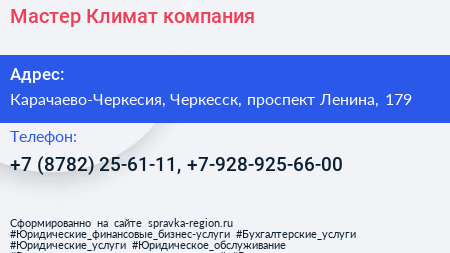 Мастер Климат, компания по адресу Карачаево-Черкесия, Черкесск, проспект Ленина, 179 в дальнейшем Организация, размещена в следующих категориях: