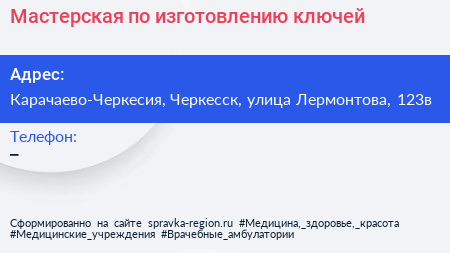 Мастерская по изготовлению ключей по адресу Карачаево-Черкесия, Черкесск, улица Лермонтова, 123в в дальнейшем Организация, размещена в следующих категориях: