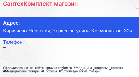 СантехКомплект, магазин по адресу Карачаево-Черкесия, Черкесск, улица Космонавтов, 30а в дальнейшем Организация, размещена в следующих категориях:
