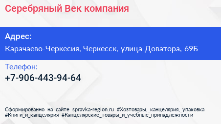 Серебряный Век, компания по адресу Карачаево-Черкесия, Черкесск, улица Доватора, 69Б в дальнейшем Организация, размещена в следующих категориях: