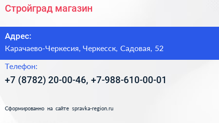 Стройград, магазин по адресу Карачаево-Черкесия, Черкесск, Садовая, 52 в дальнейшем Организация, размещена в следующих категориях: