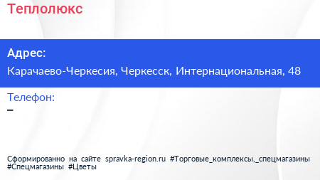 Теплолюкс по адресу Карачаево-Черкесия, Черкесск, Интернациональная, 48 в дальнейшем Организация, размещена в следующих категориях: