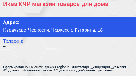 Икеа КЧР, магазин товаров для дома по адресу Карачаево-Черкесия, Черкесск, Гагарина, 18 в дальнейшем Организация, размещена в следующих категориях: