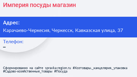Империя посуды, магазин по адресу Карачаево-Черкесия, Черкесск, Кавказская улица, 37 в дальнейшем Организация, размещена в следующих категориях: