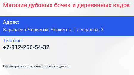 Магазин дубовых бочек и деревянных кадок по адресу Карачаево-Черкесия, Черкесск, Гутякулова, 3 в дальнейшем Организация, размещена в следующих категориях: