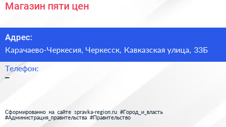 Магазин пяти цен по адресу Карачаево-Черкесия, Черкесск, Кавказская улица, 33Б в дальнейшем Организация, размещена в следующих категориях: