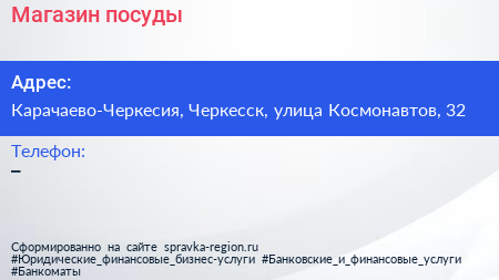 Магазин посуды по адресу Карачаево-Черкесия, Черкесск, улица Космонавтов, 32 в дальнейшем Организация, размещена в следующих категориях: