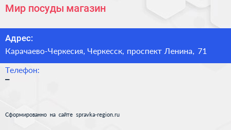 Мир посуды, магазин по адресу Карачаево-Черкесия, Черкесск, проспект Ленина, 71 в дальнейшем Организация, размещена в следующих категориях: