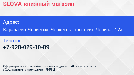 SLOVA, книжный магазин по адресу Карачаево-Черкесия, Черкесск, проспект Ленина, 12а в дальнейшем Организация, размещена в следующих категориях: