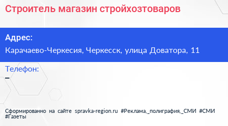 Строитель, магазин стройхозтоваров по адресу Карачаево-Черкесия, Черкесск, улица Доватора, 11 в дальнейшем Организация, размещена в следующих категориях: