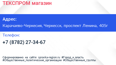 ТЕКСПРОМ, магазин по адресу Карачаево-Черкесия, Черкесск, проспект Ленина, 405г в дальнейшем Организация, размещена в следующих категориях: