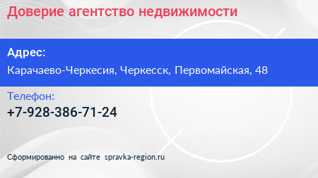 Доверие, агентство недвижимости по адресу Карачаево-Черкесия, Черкесск, Первомайская, 48 в дальнейшем Организация, размещена в следующих категориях: