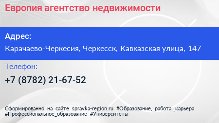 Европия, агентство недвижимости по адресу Карачаево-Черкесия, Черкесск, Кавказская улица, 147 в дальнейшем Организация, размещена в следующих категориях: