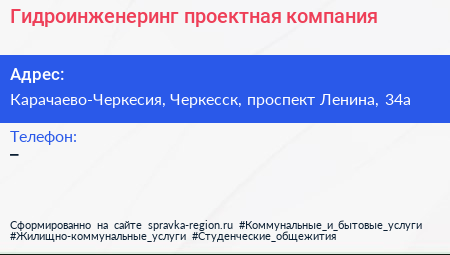 Гидроинженеринг, проектная компания по адресу Карачаево-Черкесия, Черкесск, проспект Ленина, 34а в дальнейшем Организация, размещена в следующих категориях: