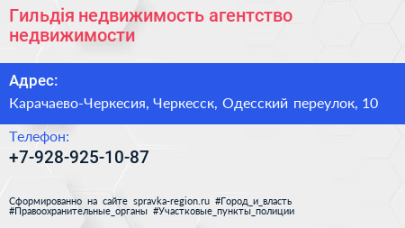 Гильдiя недвижимость, агентство недвижимости по адресу Карачаево-Черкесия, Черкесск, Одесский переулок, 10 в дальнейшем Организация, размещена в следующих категориях: