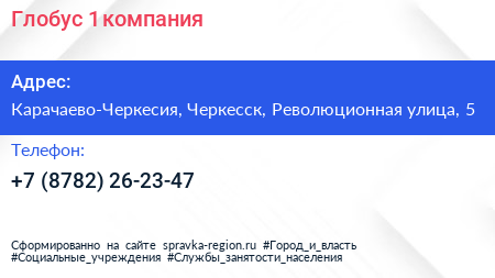 Глобус-1, компания по адресу Карачаево-Черкесия, Черкесск, Революционная улица, 5 в дальнейшем Организация, размещена в следующих категориях:
