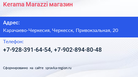 Kerama-Marazzi, магазин по адресу Карачаево-Черкесия, Черкесск, Привокзальная, 20 в дальнейшем Организация, размещена в следующих категориях: