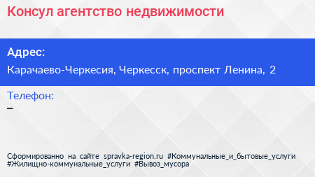 Консул, агентство недвижимости по адресу Карачаево-Черкесия, Черкесск, проспект Ленина, 2 в дальнейшем Организация, размещена в следующих категориях: