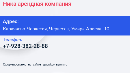 Ника, арендная компания по адресу Карачаево-Черкесия, Черкесск, Умара Алиева, 10 в дальнейшем Организация, размещена в следующих категориях:
