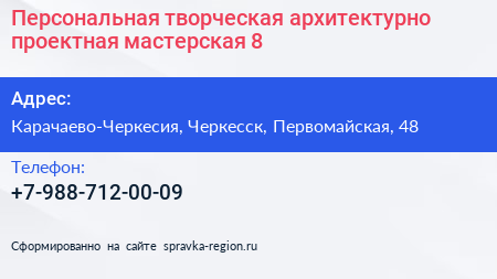 Персональная творческая архитектурно-проектная мастерская №8 по адресу Карачаево-Черкесия, Черкесск, Первомайская, 48 в дальнейшем Организация, размещена в следующих категориях: