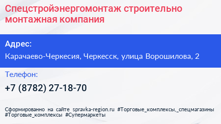 Спецстройэнергомонтаж, строительно-монтажная компания по адресу Карачаево-Черкесия, Черкесск, улица Ворошилова, 2 в дальнейшем Организация, размещена в следующих категориях: