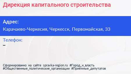 Дирекция капитального строительства по адресу Карачаево-Черкесия, Черкесск, Первомайская, 33 в дальнейшем Организация, размещена в следующих категориях: