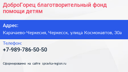 ДоброГорец, благотворительный фонд помощи детям по адресу Карачаево-Черкесия, Черкесск, улица Космонавтов, 30а в дальнейшем Организация, размещена в следующих категориях: