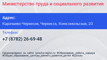 Министерство труда и социального развития по адресу Карачаево-Черкесия, Черкесск, Комсомольская, 23 в дальнейшем Организация, размещена в следующих категориях: