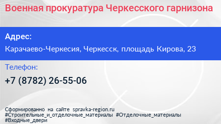 Военная прокуратура Черкесского гарнизона по адресу Карачаево-Черкесия, Черкесск, площадь Кирова, 23 в дальнейшем Организация, размещена в следующих категориях: