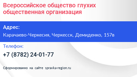 Всероссийское общество глухих, общественная организация по адресу Карачаево-Черкесия, Черкесск, Демиденко, 157в в дальнейшем Организация, размещена в следующих категориях: