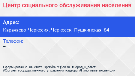 Центр социального обслуживания населения по адресу Карачаево-Черкесия, Черкесск, Пушкинская, 84 в дальнейшем Организация, размещена в следующих категориях: