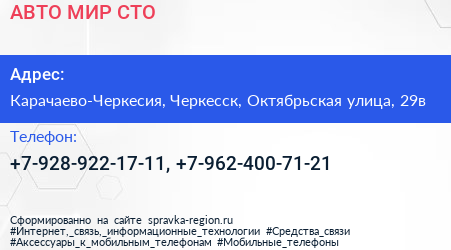 АВТО МИР, СТО по адресу Карачаево-Черкесия, Черкесск, Октябрьская улица, 29в в дальнейшем Организация, размещена в следующих категориях: