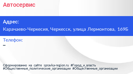 Автосервис по адресу Карачаево-Черкесия, Черкесск, улица Лермонтова, 169Б в дальнейшем Организация, размещена в следующих категориях: