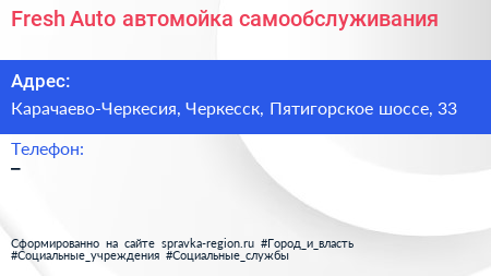 Fresh Auto, автомойка самообслуживания по адресу Карачаево-Черкесия, Черкесск, Пятигорское шоссе, 33 в дальнейшем Организация, размещена в следующих категориях: