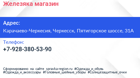 Железяка, магазин по адресу Карачаево-Черкесия, Черкесск, Пятигорское шоссе, 31А в дальнейшем Организация, размещена в следующих категориях: