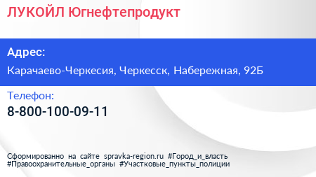 ЛУКОЙЛ-Югнефтепродукт по адресу Карачаево-Черкесия, Черкесск, Набережная, 92Б в дальнейшем Организация, размещена в следующих категориях: