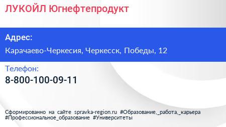 ЛУКОЙЛ-Югнефтепродукт по адресу Карачаево-Черкесия, Черкесск, Победы, 12 в дальнейшем Организация, размещена в следующих категориях: