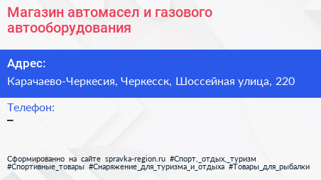 Магазин автомасел и газового автооборудования по адресу Карачаево-Черкесия, Черкесск, Шоссейная улица, 220 в дальнейшем Организация, размещена в следующих категориях: